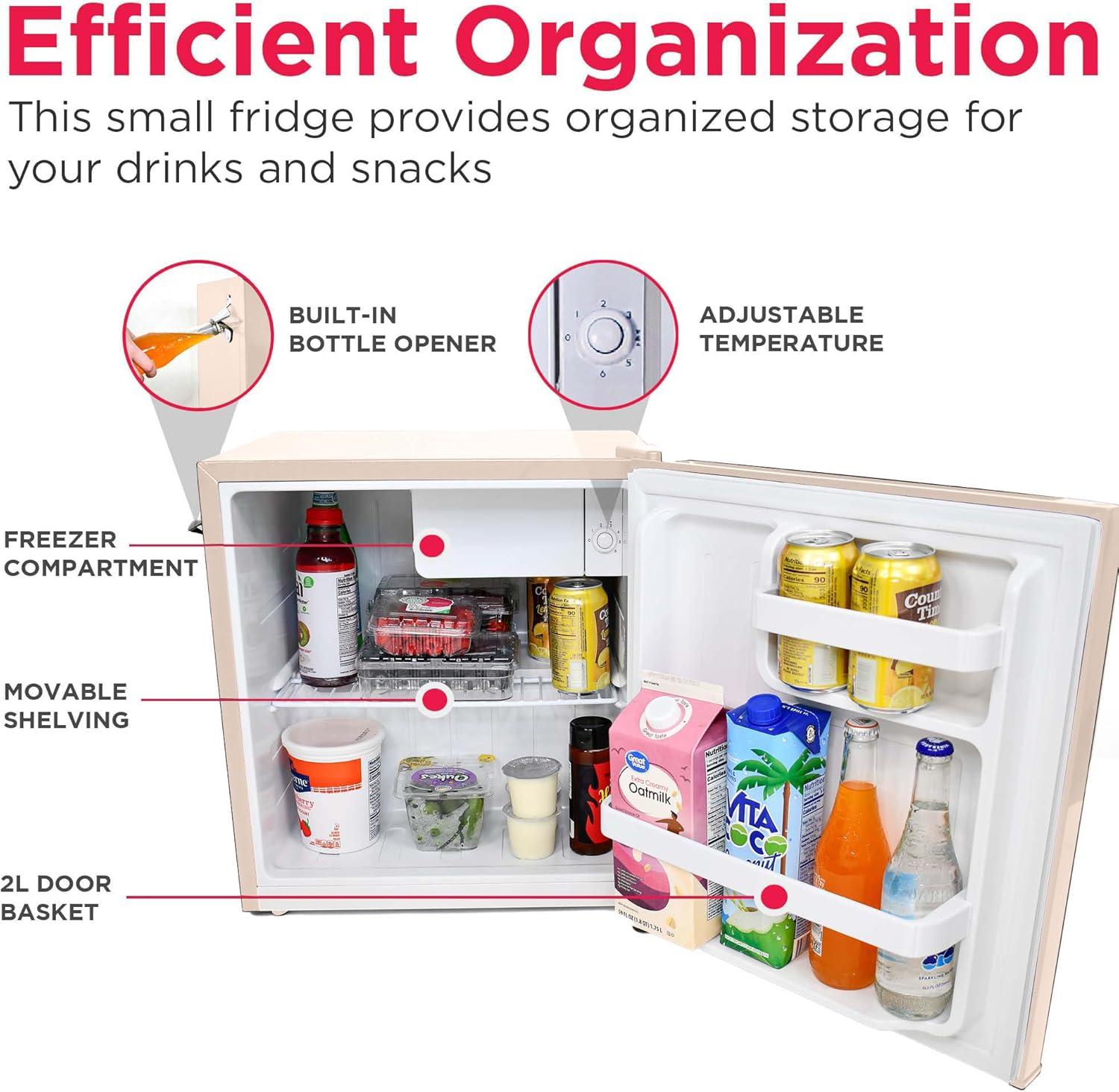 ADJUSTABLE TEMPERATURE – Our mini refrigerator's thermostat control offers several temperature settings for better adaptation to external temperature and lower energy bills. This tiny refrigerator also has a light-degree freezing storage compartment for ice cubes.