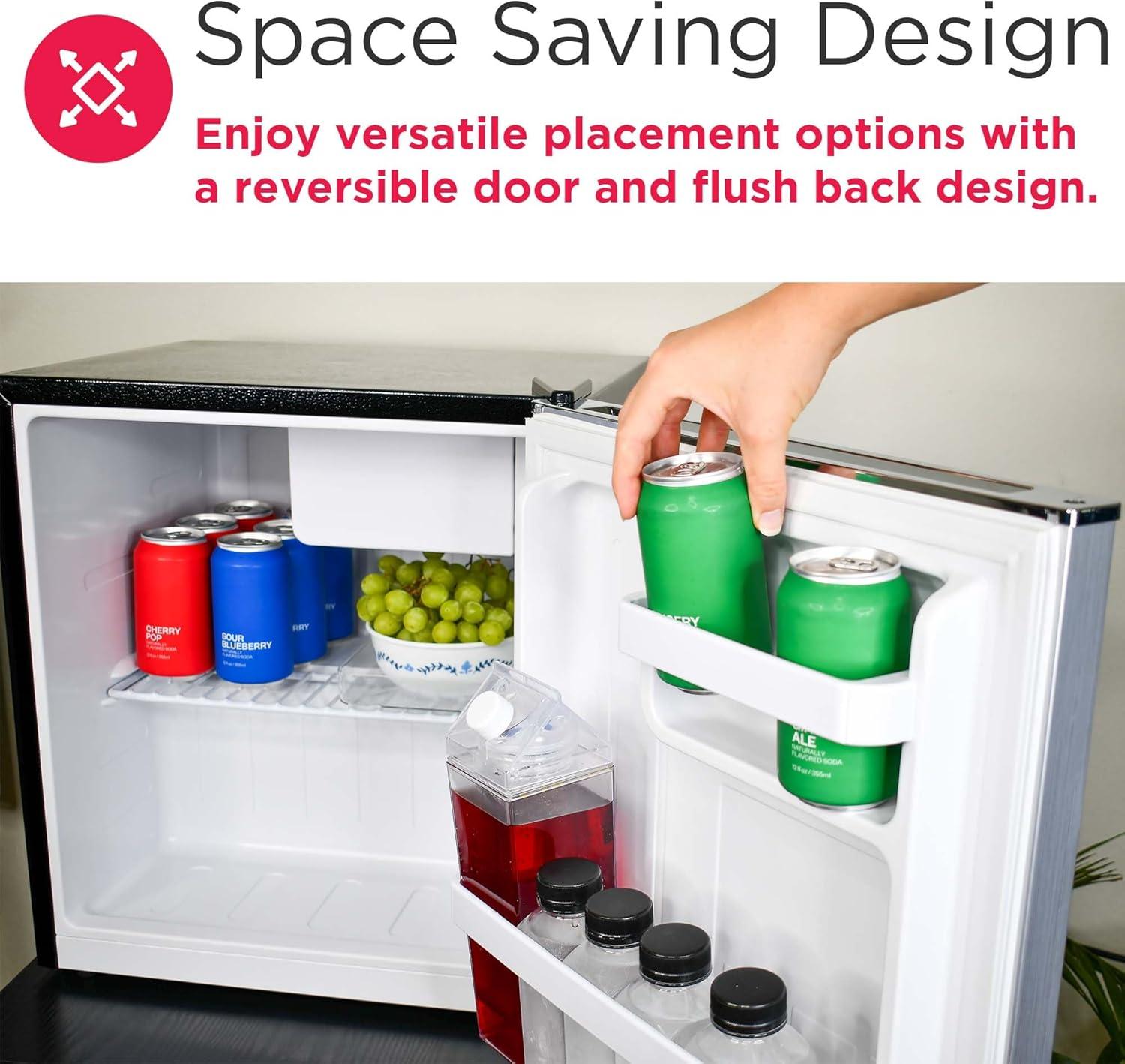 The Mini Refrigerator has enough room for your groceries and is compact enough to fit almost anywhere. It features an ice cube chamber freezer with a small freezing compartment, an ice cube tray and an integrated tall bottle holder. The slide-out shelf helps keep your items organized, and has a reversible door design. A sleek, stylish stainless steel finish, invisible door handle and clean lines blend nicely with any decor, and the efficient compressor cooling system ensures low energy consumption and is free from CFC.