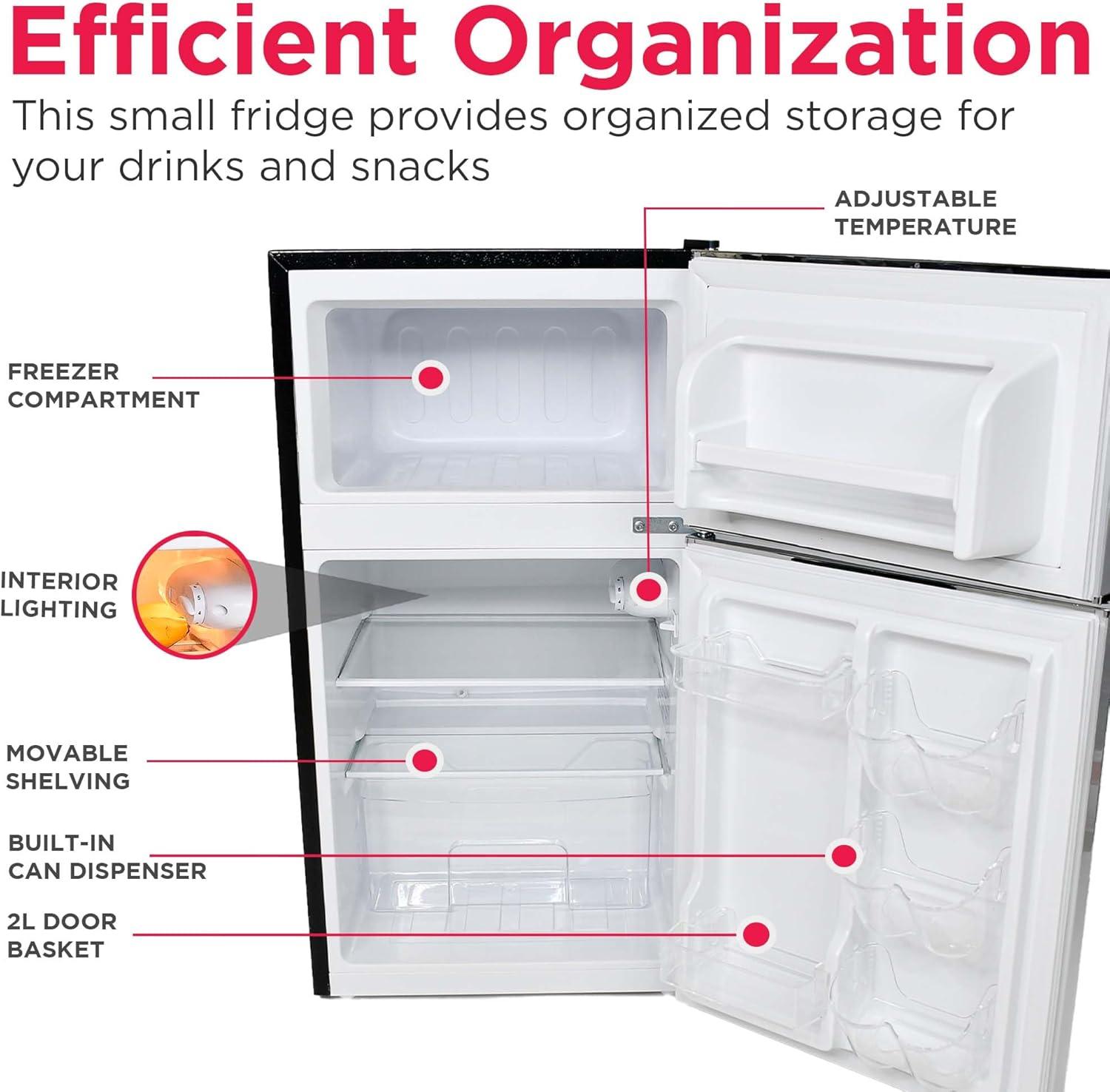 Frigidaire Fridge Freezer Combo P Sleek & Compact P Efficient Storage P Upscale Retro Look Vintage Appeal, Modern Convenience Indulge in the ultimate convenience with this spacious yet compact fridge freezer combo. Its unique retro look and stainless steel finish offers modern appeal mixed with vintage flair. Equipped with reversible doors and pull handles for easy access, this mini fridge combines upscale style with practical finishes. Experience seamless placement and flexibility with its space-saving flush back design. This small upright fridge offers multiple storage options including a 2-liter door basket, integrated can dispenser, and clear crisper bin to keep your items organized and visible. Top Features: • Compact fridge freezer combo • 3.2 cu. ft. capacity • Multiple storage compartments • Stainless steel finish with chrome trim • Dimensions: 21.26″D x 17.83″W x 33.5″H Spacious Storage With a 3.2 cu. ft. capacity with a separate freezer compartment, this mini fridge offers ample room for all your drinks and snacks, while the full-size freezer ensures plenty of space for frozen treats. Enhanced Organization The small fridge comes equipped with two durable glass shelves, a can dispenser, 2L bottle holder, and clear crisper bin for organized storage that maximizes space and keeps everything easily accessible. Effortless Placement The compact fridge's space-saving flush back design seamlessly fits against walls, corners, and tight spaces, while the reversible door adds flexibility to suit your space perfectly.