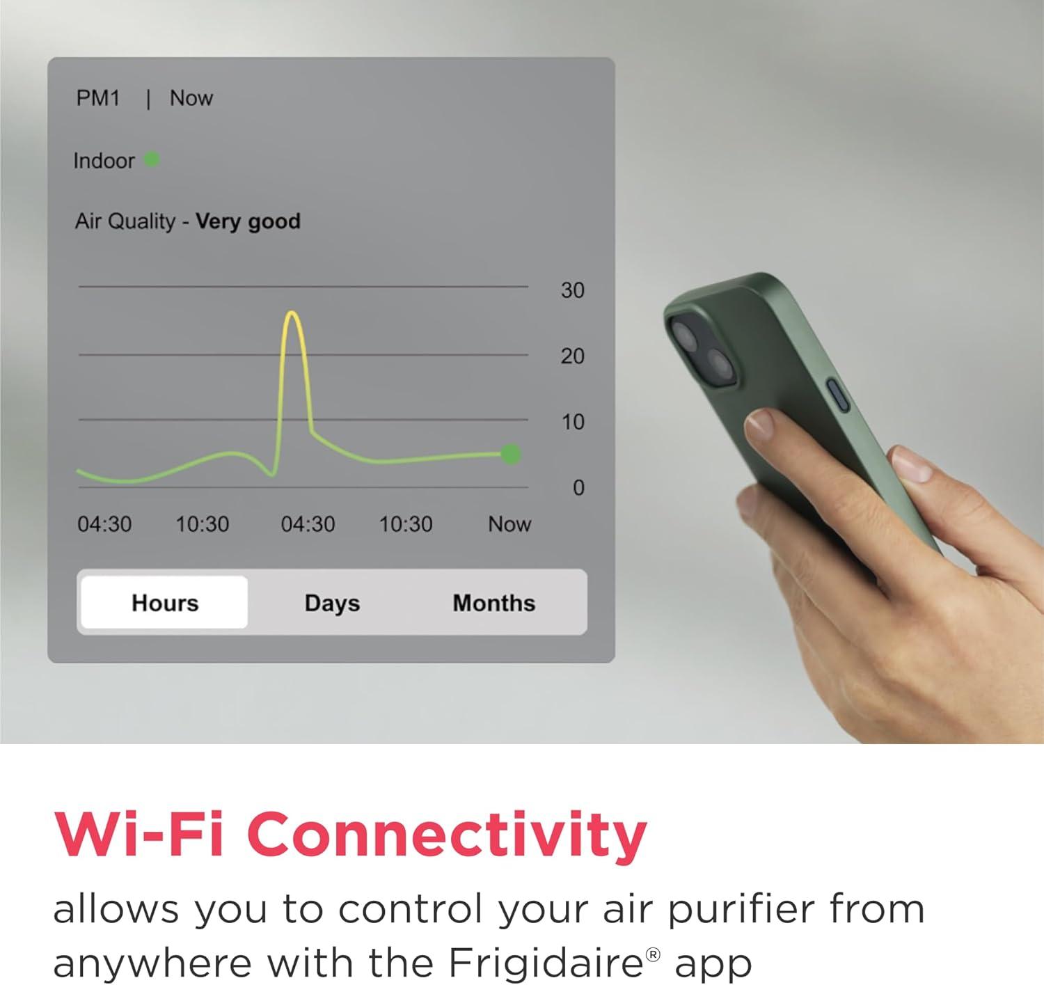 Wi-Fi Enabled Control: Manage your air purifier from anywhere with the Frigidaire app, allowing you to set schedules, track air quality, adjust settings, and monitor filter life effortlessly